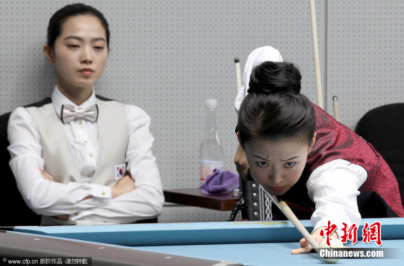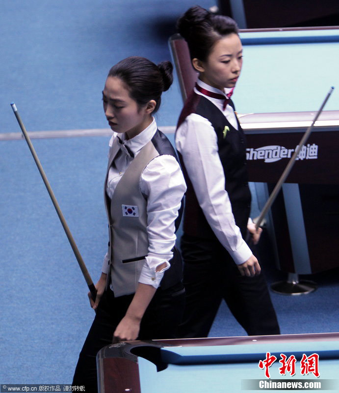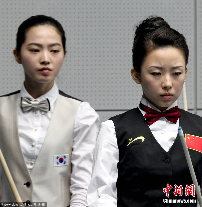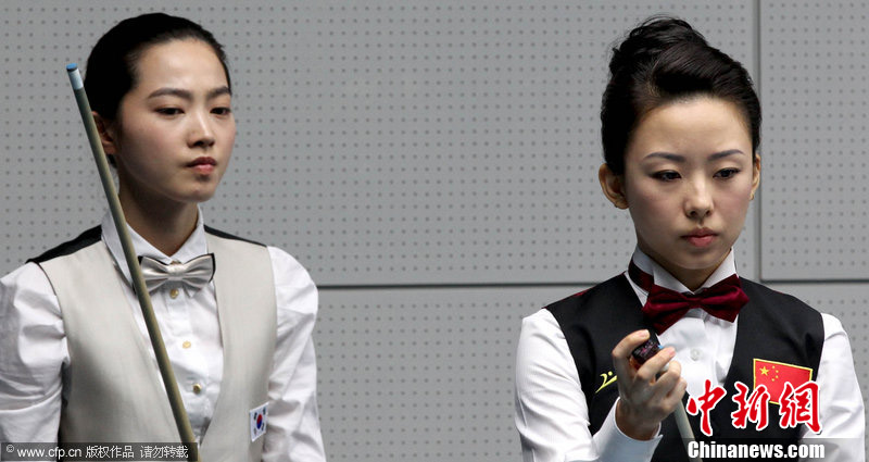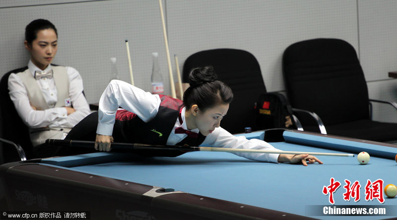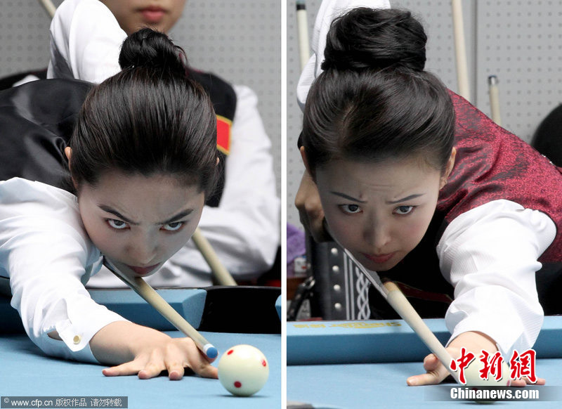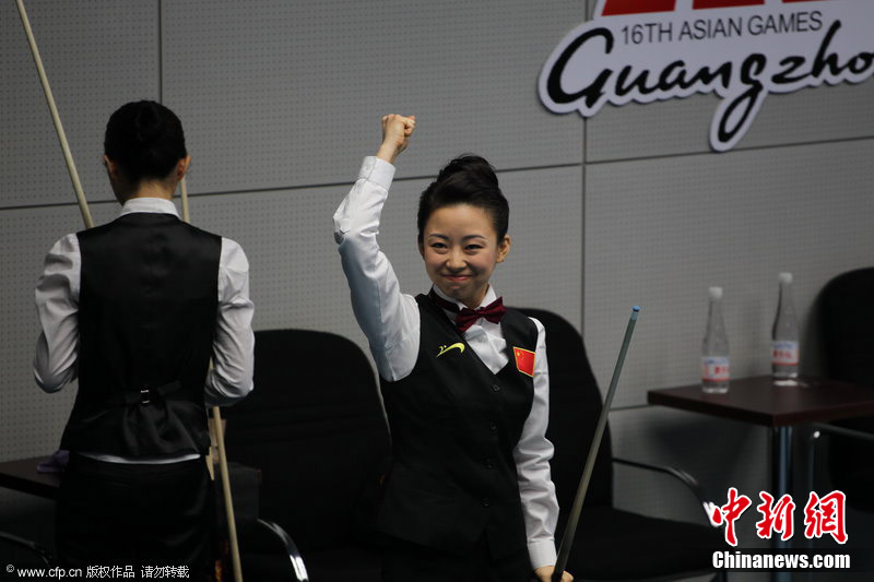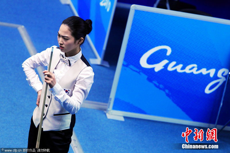 11月18日,2010廣州亞運會女子美式9球單打1/4決賽,兩位公認的臺壇美女展開激烈爭奪,最終,中國選手潘曉婷以7:6的最終比分戰(zhàn)勝韓國的車侑藍(車俞嵐)晉級下一輪。圖片來源:cfp視覺中國