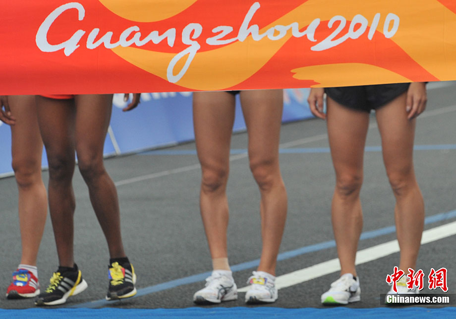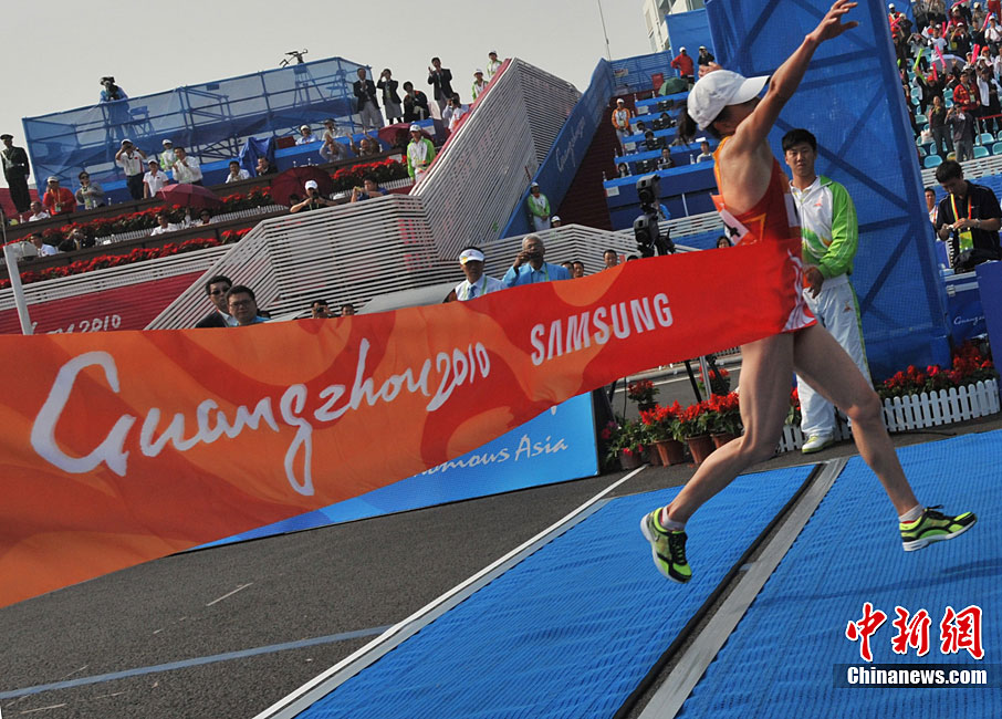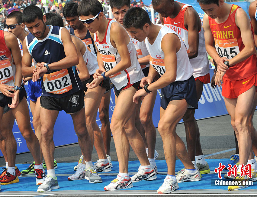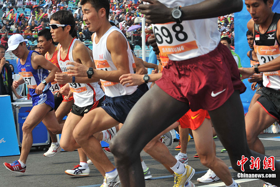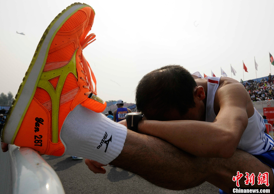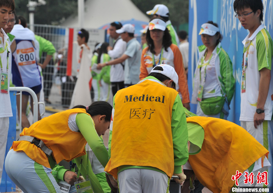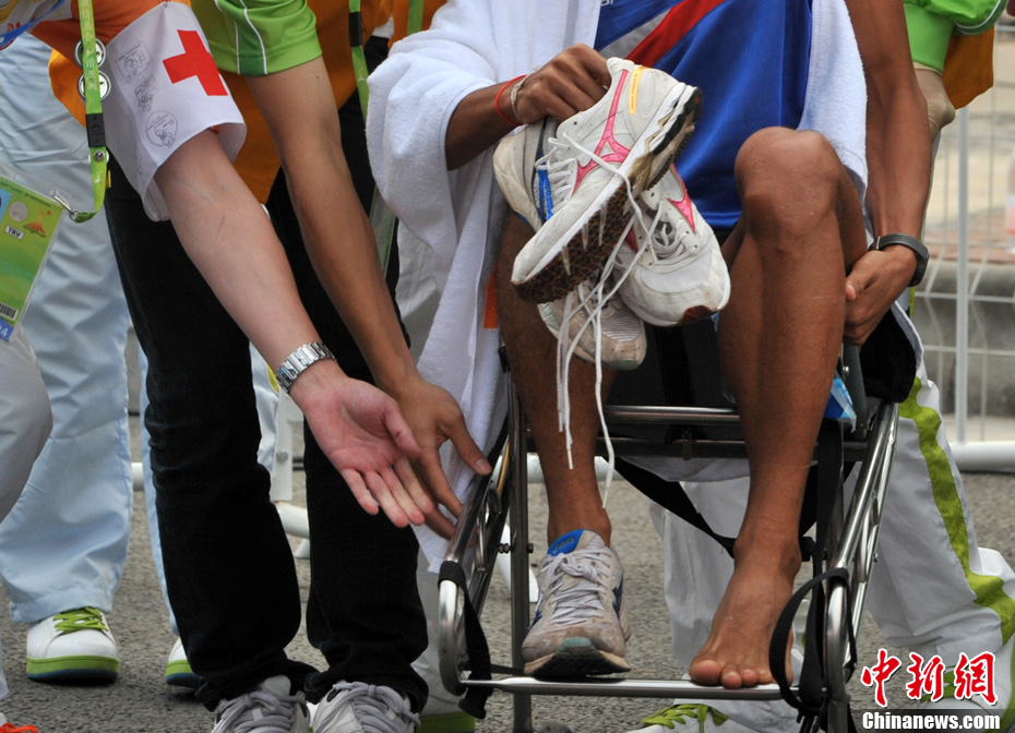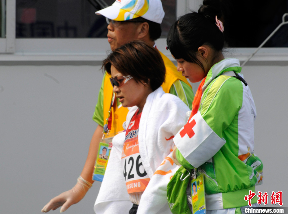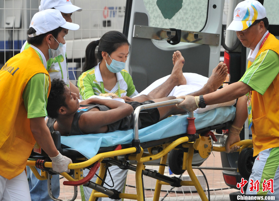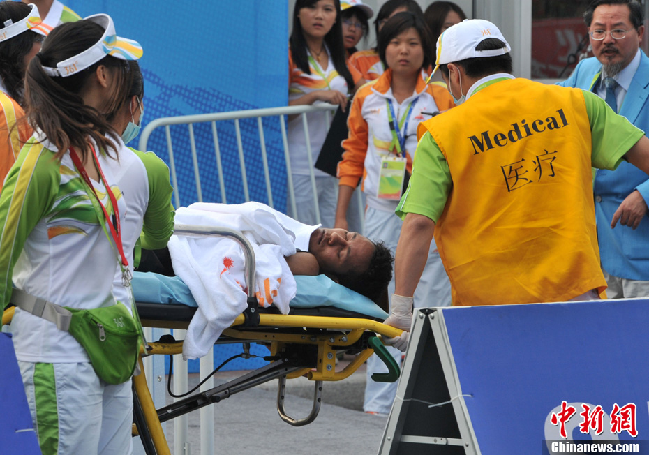 11月27日,廣州亞運(yùn)會最后一天的馬拉松比賽在艷陽天里舉行,中午開始的男子賽事出現(xiàn)多名選手累倒和受傷。圖為一名蒙古選手累倒后被醫(yī)護(hù)志愿者送院治療。中新社記者 賈國榮 攝
