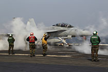 韓美聯(lián)合軍演11月29日進(jìn)入第二天,兩國軍隊(duì)繼續(xù)展開航母大隊(duì)訓(xùn)練和海上防御等高強(qiáng)度軍演。圖為F/A-18F超級大黃蜂戰(zhàn)機(jī)從“喬治·華盛頓”號航母甲板上起飛。