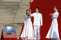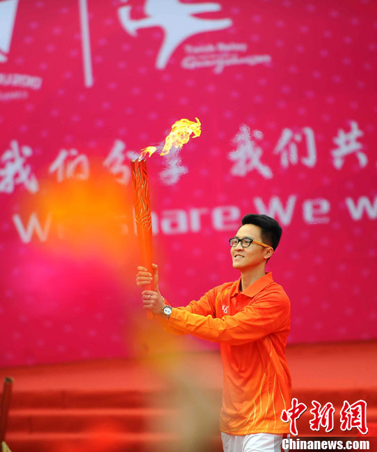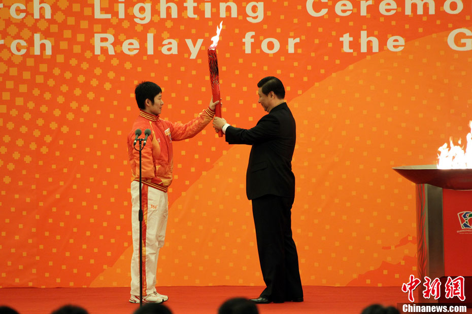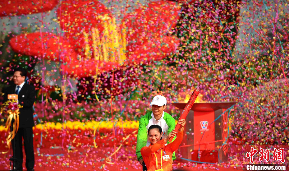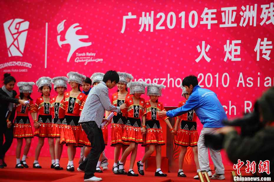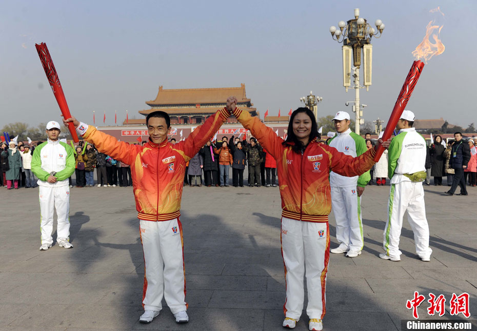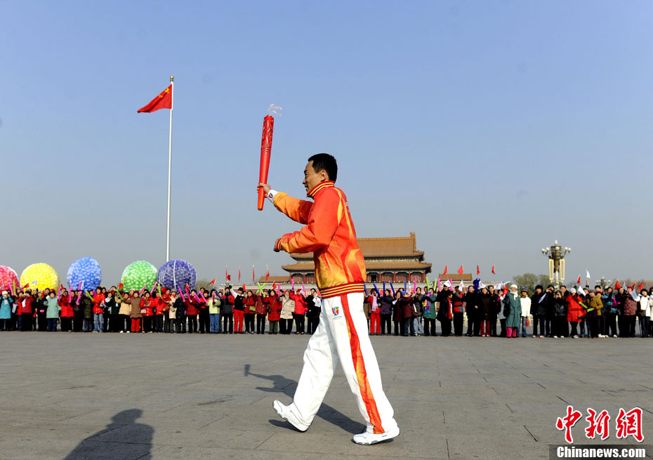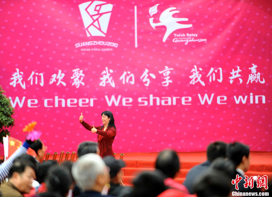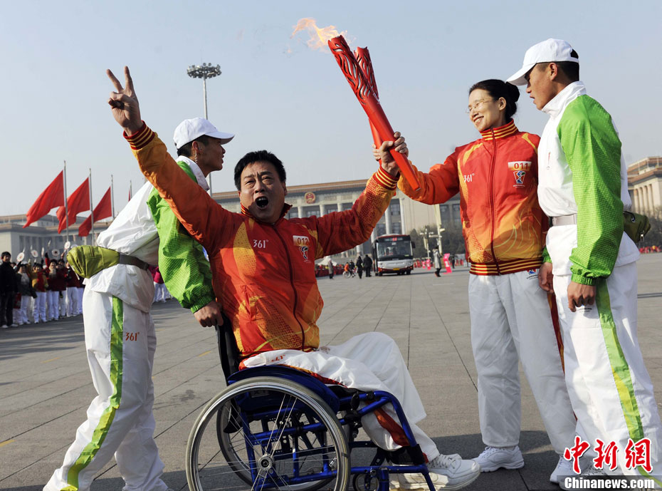 12月4日10時(shí)整,廣州2010年亞洲殘疾人運(yùn)動(dòng)會(huì)火炬點(diǎn)燃暨火炬?zhèn)鬟f活動(dòng)在北京人民大會(huì)堂北大廳啟動(dòng)。北京站傳遞活動(dòng)有20棒火炬手,整個(gè)火炬?zhèn)鬟f活動(dòng)圍繞天安門廣場(chǎng)北廣場(chǎng)進(jìn)行。中新社記者 劉震 攝