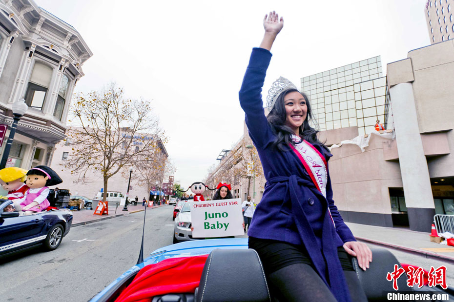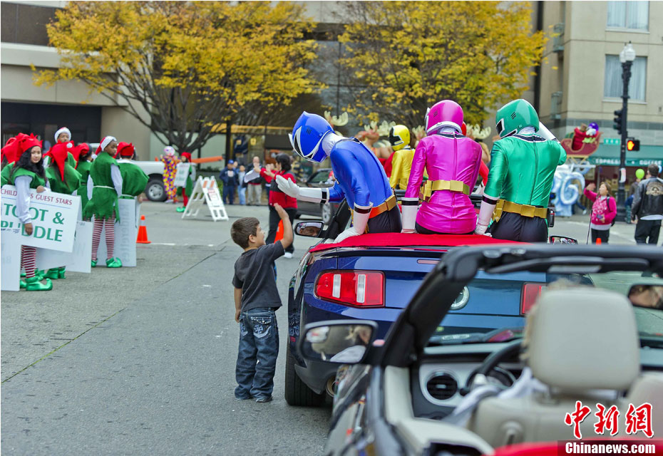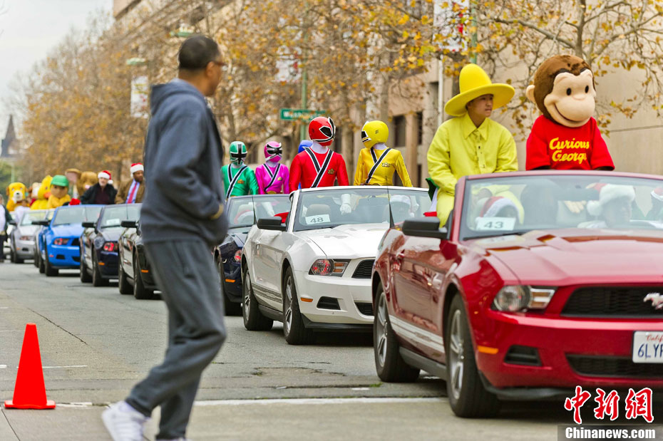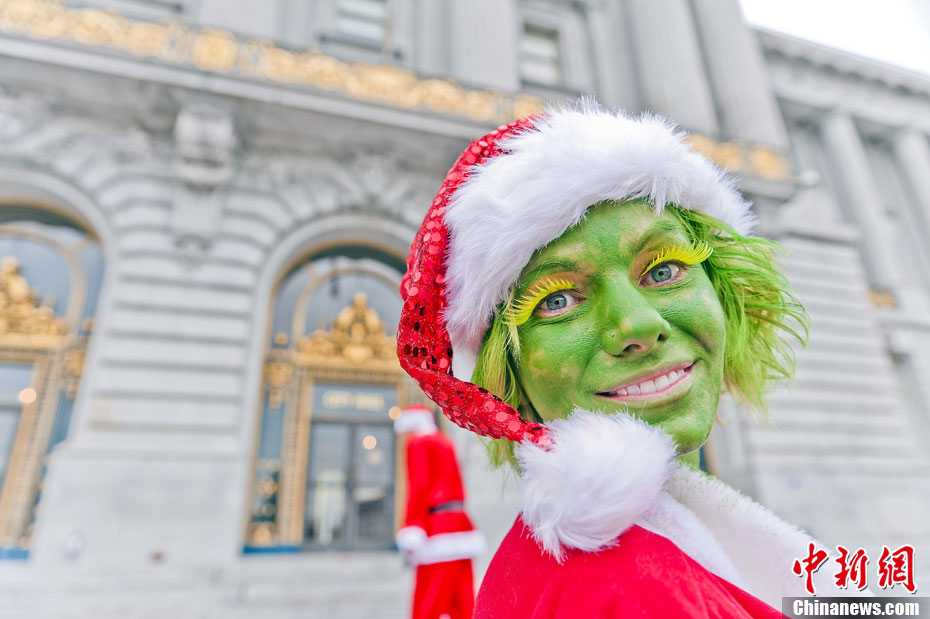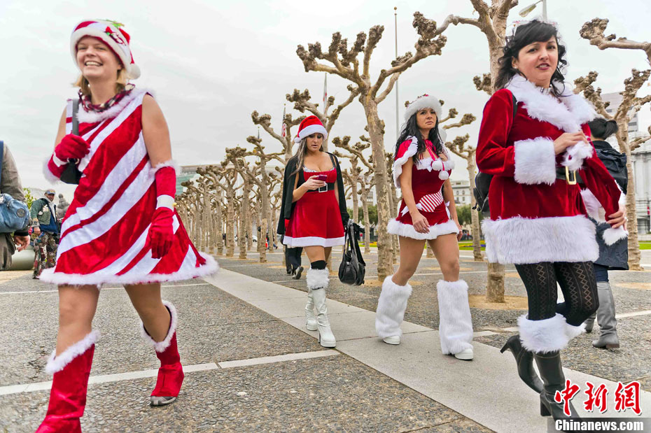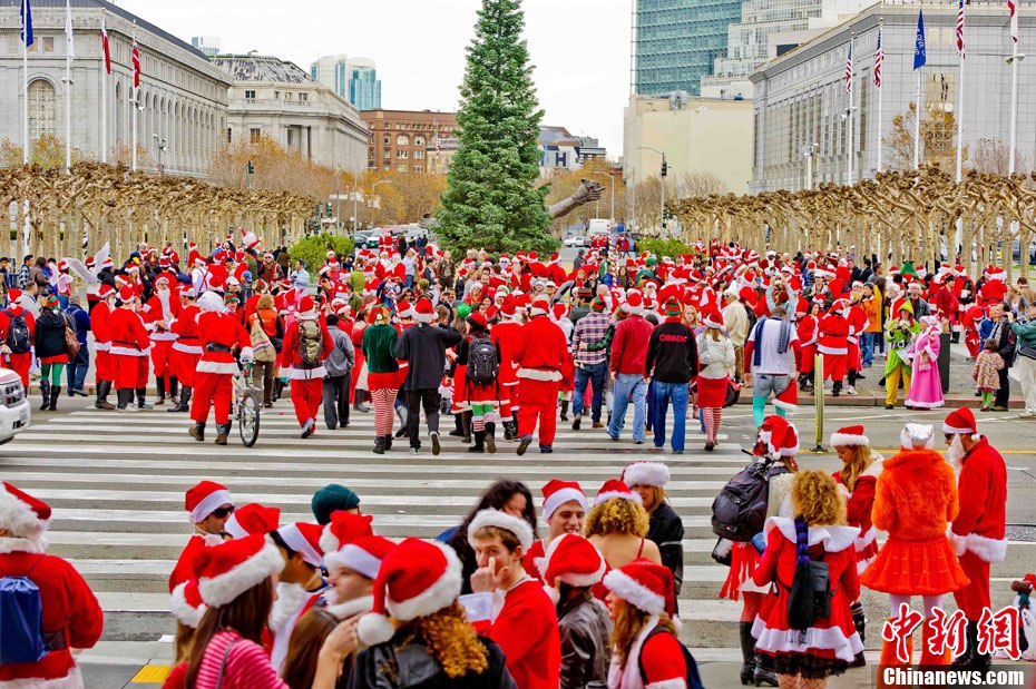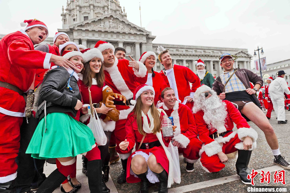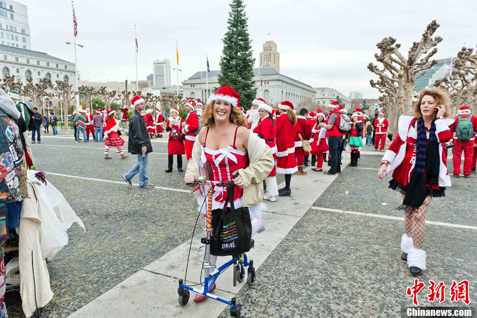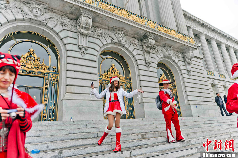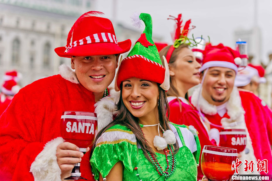 當?shù)貢r間12月4日下午,千余名裝扮成圣誕老人的男男女女聚集在美國舊金山市政府廣場前,以歌舞形式迎接圣誕佳節(jié)。圖為情侶們的開心一刻。中新社發(fā) 陳鋼 攝