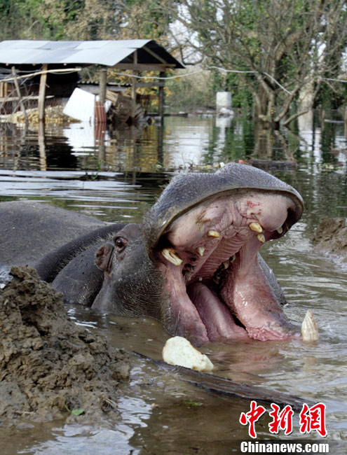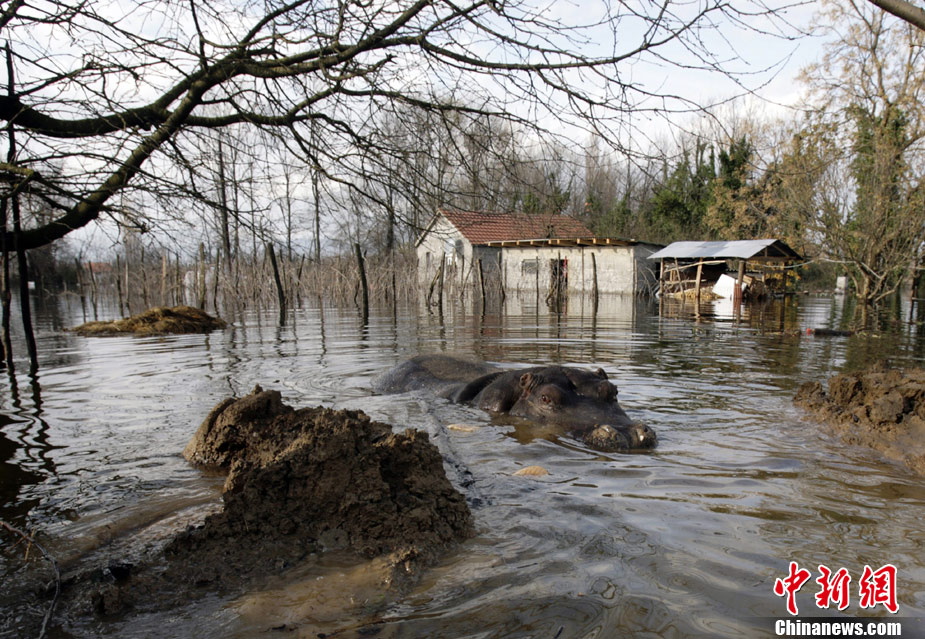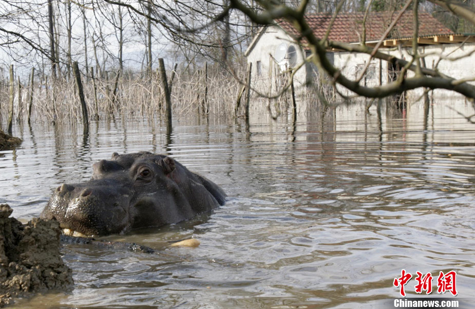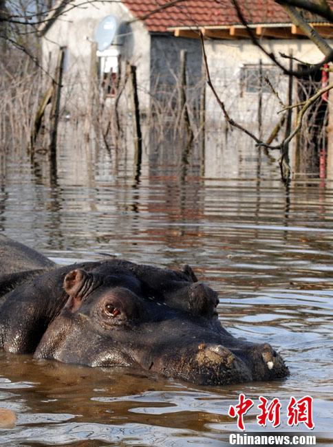 巴爾干半島西部連日來頻遭大雨侵襲,造成波斯尼亞和黑塞哥維那、塞爾維亞、黑山和阿爾巴尼亞的許多地區(qū)洪水泛濫,數(shù)千人被迫撤離家園。圖為6日,在黑山的普拉夫尼察,一頭從動物園中逃出的河馬在洪水中游泳。