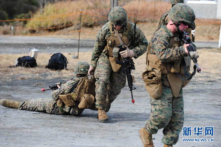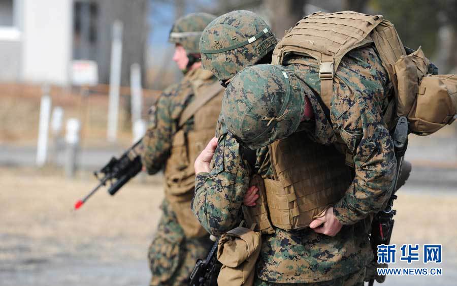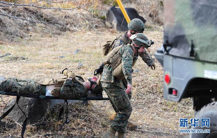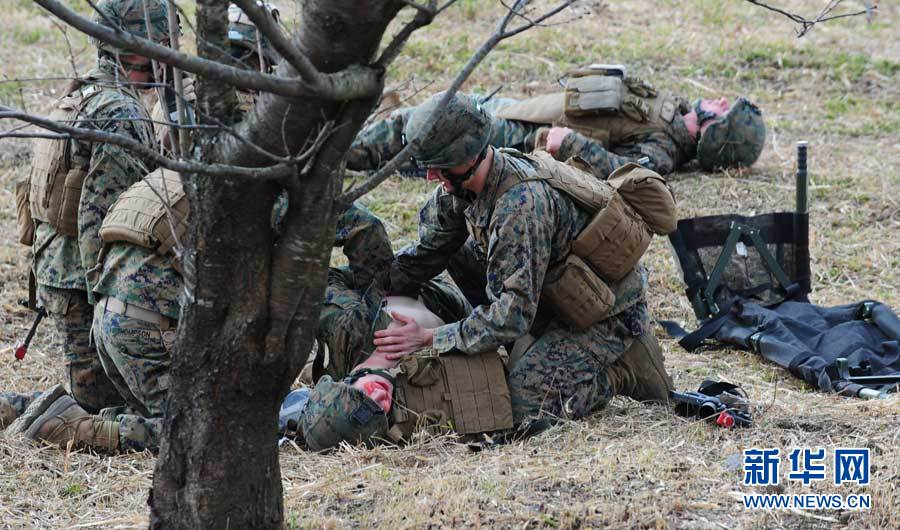 12月7日,在位于日本宮崎縣和鹿兒島縣交界處的霧島演習場,參加演習的美國海軍陸戰(zhàn)隊士兵在“救護”戰(zhàn)斗中的“傷員”。