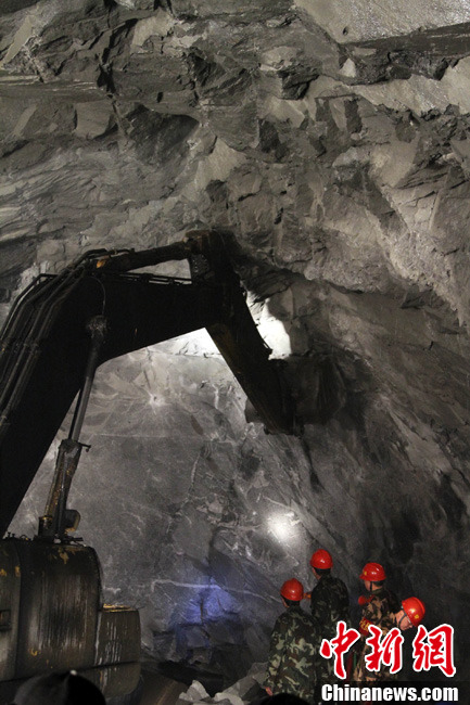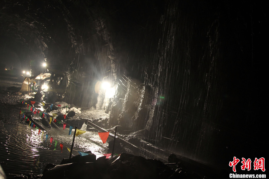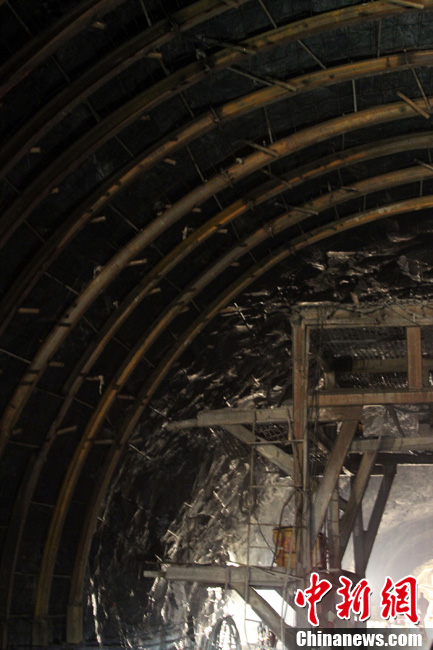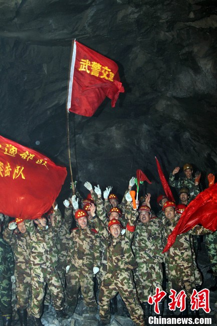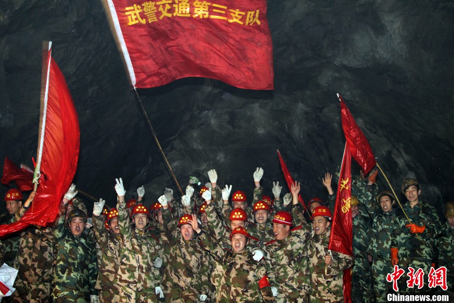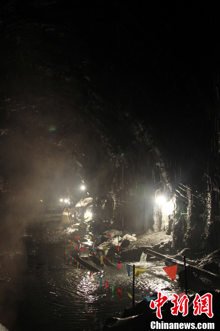 西藏墨脫公路控制性工程嘎隆拉隧道15日上午在海拔3700多米的隧道口順利貫通。墨脫人民世代被茫茫雪山所阻隔的歷史終于結(jié)束。隧道貫通后,參建者在貫通處歡呼。中新社記者 徐長安 攝