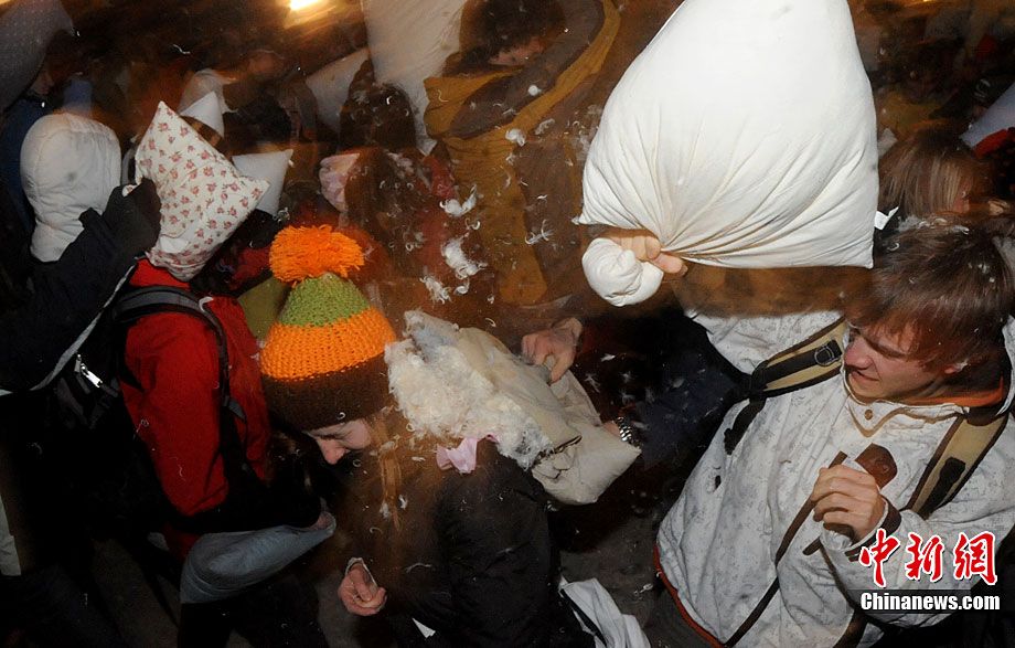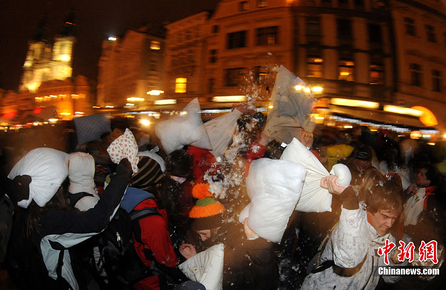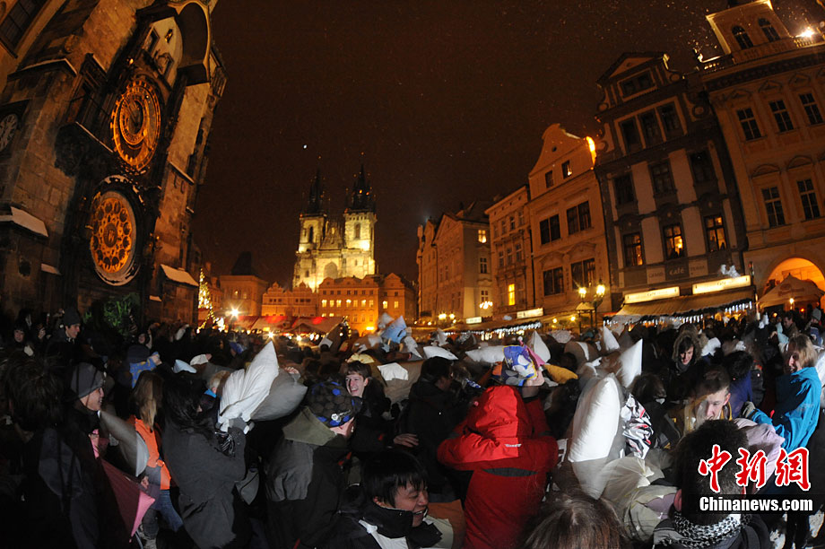 12月16日,人們在捷克布拉格的老城廣場上參加為時三分鐘的枕頭大戰(zhàn)。