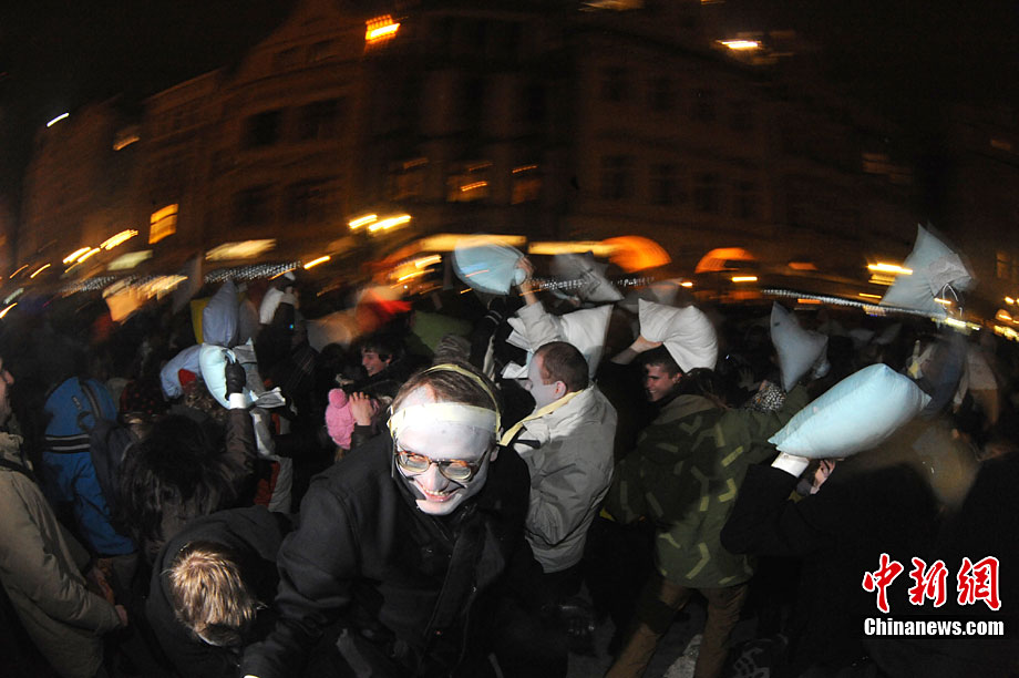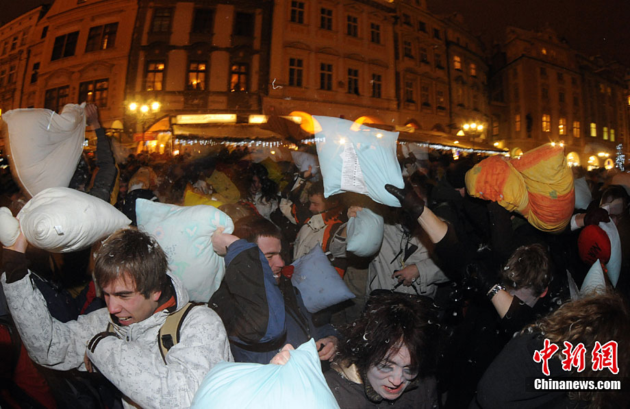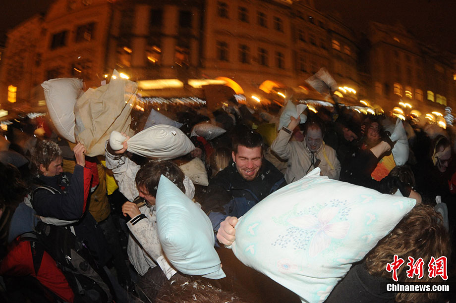 捷克布拉格廣場上演“枕頭大戰(zhàn)”