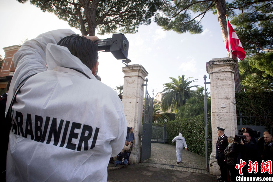 瑞士駐意大利使館一名職員當天在拆開一個郵包時,郵包發(fā)生爆炸,該工作人員雙手嚴重受傷,目前正在醫(yī)院接受治療。時隔不久,智利駐意大利使館也發(fā)生郵包爆炸事件,一名工作人員受傷,所幸沒有生命危險。圖為在智利大使館前警方拉起了警戒線。