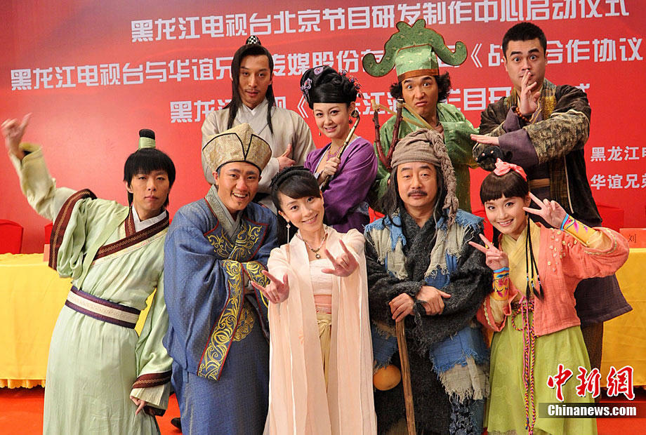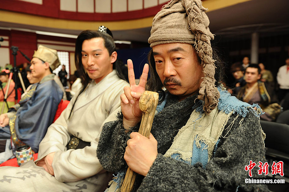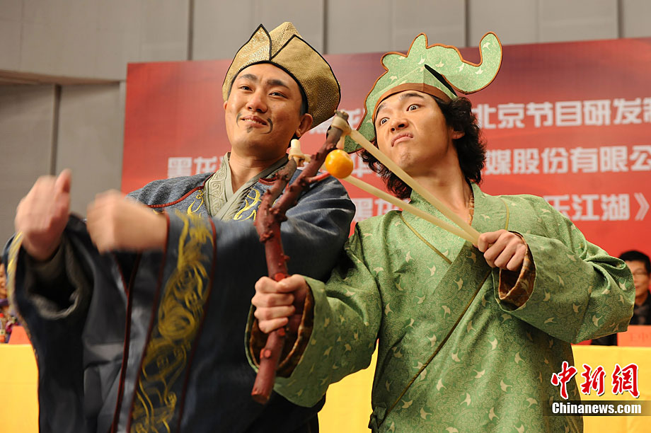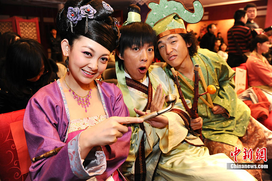 12月28日,古裝娛樂欄目劇《快樂江湖》在黑龍江電視臺北京節(jié)目研發(fā)制作中心正式開機。該劇由黑龍江電視臺與華誼兄弟聯(lián)手打造,講述了幾個現(xiàn)代人“穿越”到唐代的無厘頭爆笑故事。圖為劇中的“無厘頭”演員團隊。中新社記者 李學仕 攝