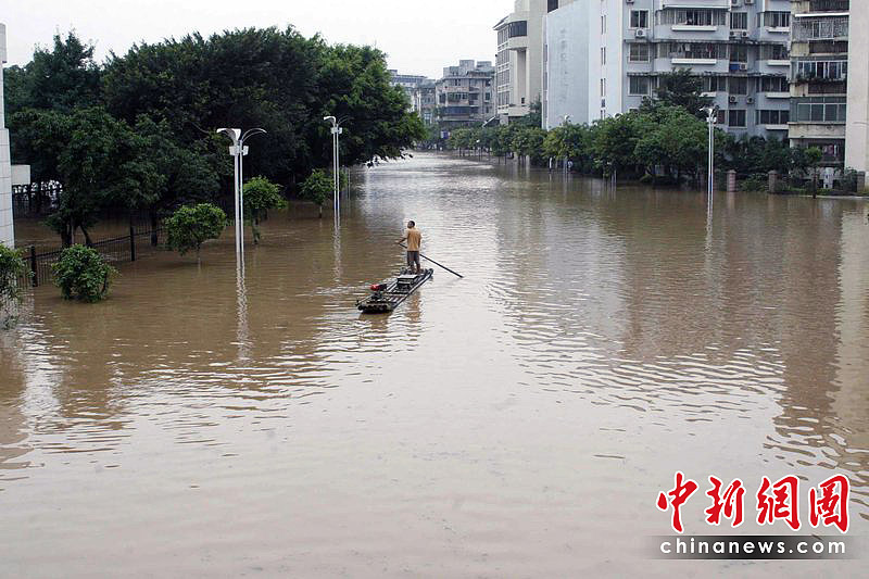 2010年6月17日,廣西桂林市出現(xiàn)大到暴雨、局部大暴雨天氣。漓江洪水倒流入市區(qū),市民坐竹排出行。東華/CFP
