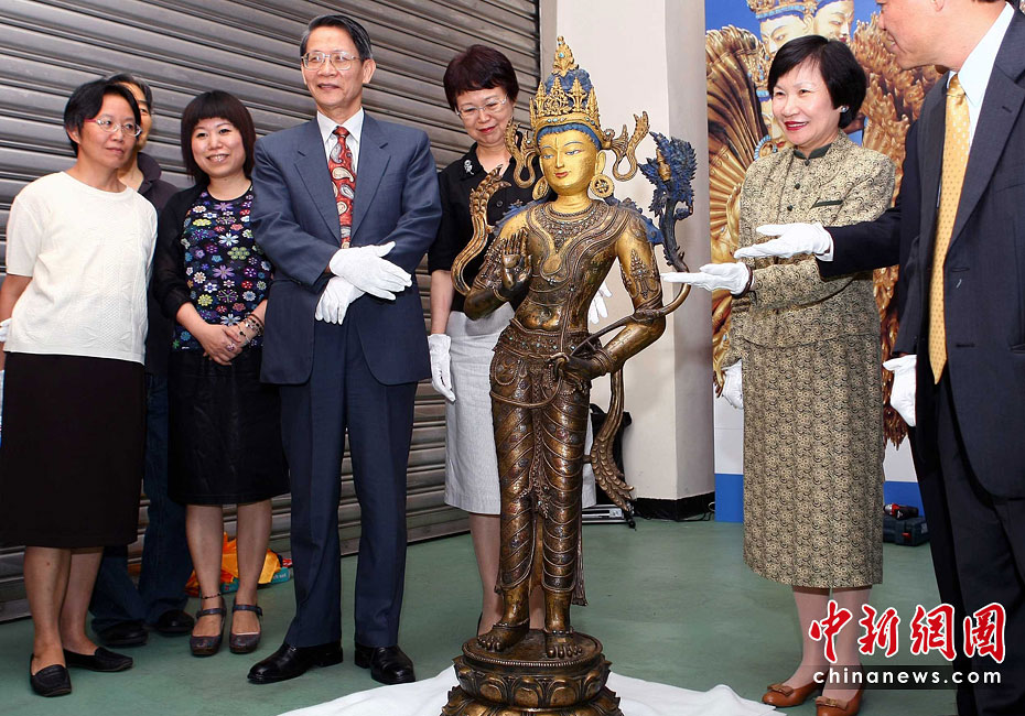 6月25日,工作人員將“鎏金銅彌勒菩薩像”、“金翅白海螺法號(hào)”、“八瓣蓮花曼荼鑼”等3件重量級(jí)文物開(kāi)箱。7月1日,臺(tái)灣故宮博物院將舉辦“圣地西藏---最接近天空的寶藏”特展,展覽分“吐蕃王朝”、“金色寶藏”、“文化交流”、“雪域風(fēng)情”四部分,共有130組件文物參展。中新社記者 宋吉河 攝