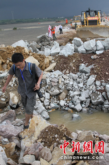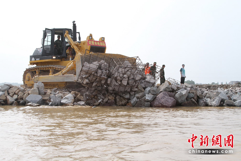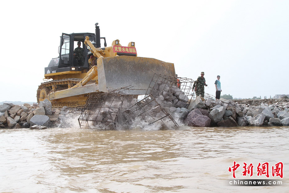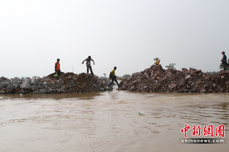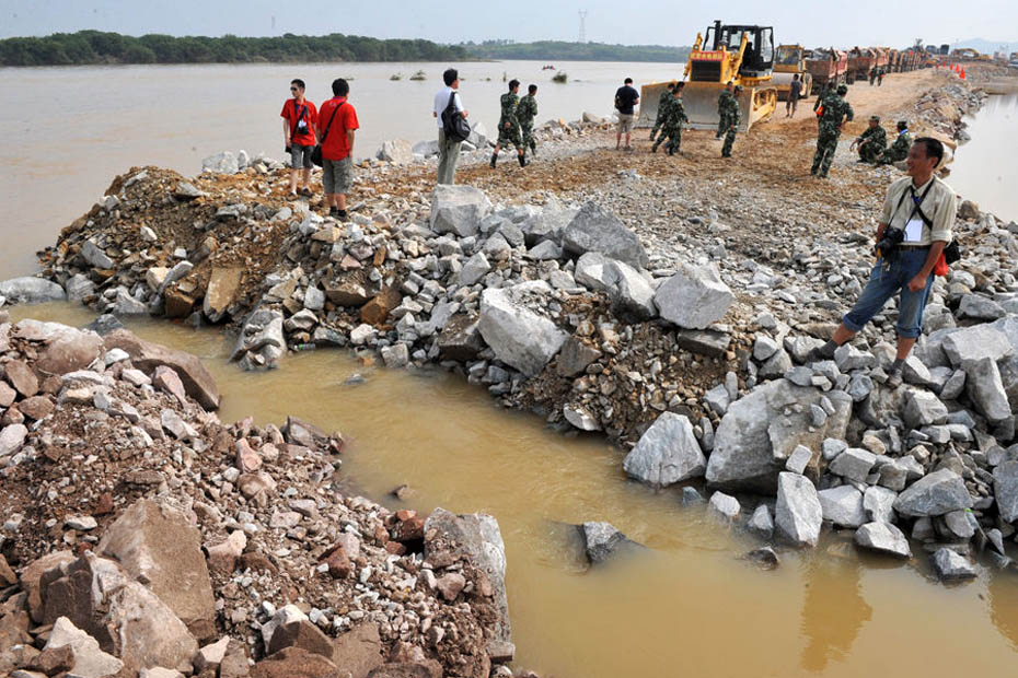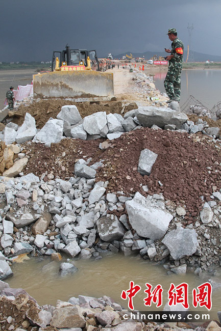 隨著最后一車土石投入河道,決口6天的江西撫州唱凱大堤終于合龍,恢復(fù)了它完整的堤身。原計劃6天完成的決口封堵任務(wù)提前3天完成。圖片來源:新華網(wǎng) 章武 攝