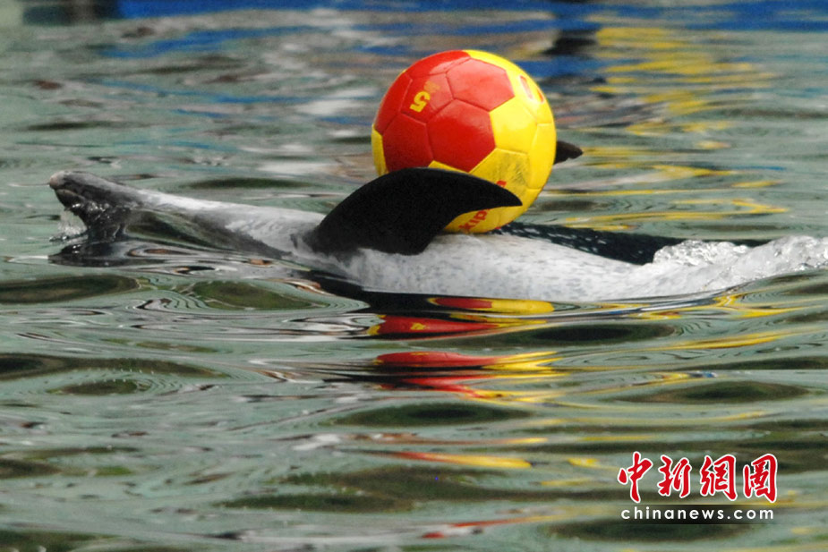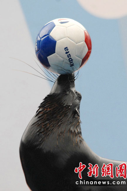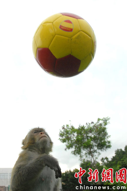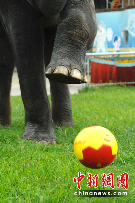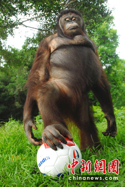 2010年南非世界杯六月底正在如火如荼地進(jìn)行,人們?cè)俅闻d起一輪熱愛(ài)足球的浪潮。居住在深圳野生動(dòng)物園里的動(dòng)物們也不甘落后,它們也紛紛玩起足球過(guò)把癮。中新社發(fā) 李木生 攝