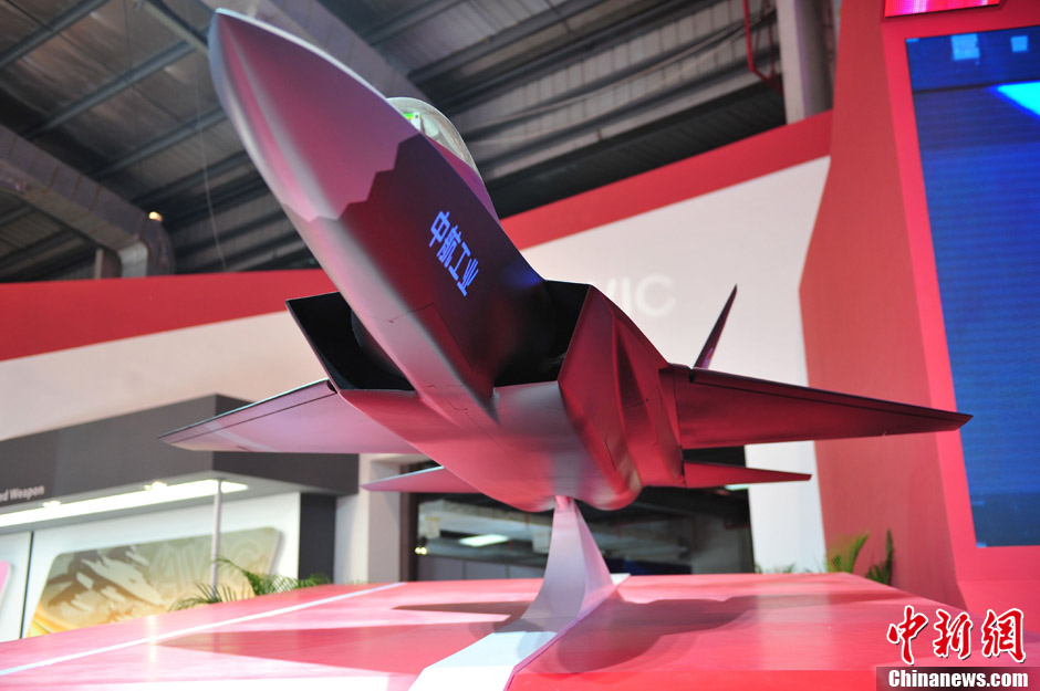 11月13日上午,第九屆中國國際航空航天博覽會(huì)在廣東珠海開幕,一架中國先進(jìn)戰(zhàn)斗機(jī)概念模型在中航工業(yè)展臺(tái)亮相,從外形上看,與前不久成功試飛的殲31相似,備受關(guān)注。中新社發(fā) 柯小軍 攝