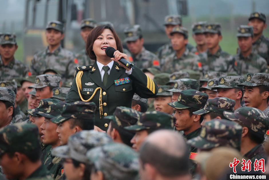 8月10日,隨同中方參演部隊赴俄羅斯參加“和平使命-2013”中俄聯(lián)演的沈陽軍區(qū)政治部文工團演員們,為中俄千余名參演官兵獻上了一場精彩的文藝晚會。豐富多彩的文藝節(jié)目,將位于切巴爾庫爾訓練場的中俄聯(lián)演野營村,變成了友誼的盛會、歡樂的海洋。 圖為演唱歌曲《當那一天來臨》。中新社發(fā) 李祥輝 攝