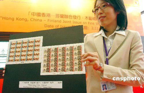 11月2日,香港郵政署與芬蘭聯(lián)合發(fā)行“木藝精華”特別郵票舉行發(fā)行儀式,該套兩枚面值港幣五元的郵票,分別展示中國(guó)香港的清代夔龍紋紫檀太師椅,以及芬蘭的千禧年代橢圓皺紋樺木盛器。圖為香港郵政署職員展示“木藝精華”特別郵票的套折。中新社發(fā) 鄧慶樂(lè) 攝
