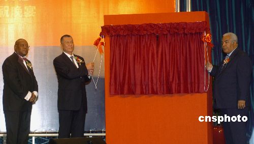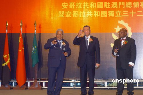十一月九日晚,安哥拉共和國(guó)駐澳門總領(lǐng)事館開幕典禮暨安哥拉獨(dú)立三十二周年慶祝酒會(huì)在澳門漁人碼頭舉行,澳門特首何厚鏵與安哥拉共和國(guó)外交部秘書長(zhǎng)Manuel Gomes dos Santos為安哥拉共和國(guó)駐澳門總領(lǐng)事館揭幕。 中新社發(fā) 史利 攝