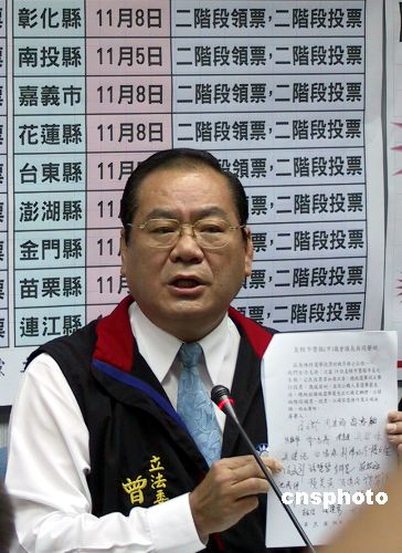 中國國民黨立法院黨團十一月十四日表示,支持十八個縣市選舉委員會的決定,希望明年“立委”選舉與“公投”同日舉行時,采用“二階段領(lǐng)票,二階段投票”方式,讓選舉順暢單純。圖為國民黨政策會執(zhí)行長曾永權(quán)出示全臺灣二十五個縣市議會議長的共同聲明,他們表示支持這一投票方式。中新社發(fā) 劉舒凌 攝