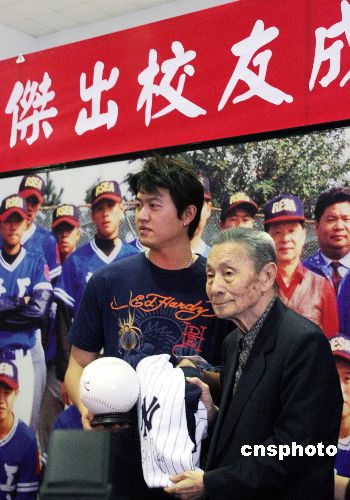 11月23日,臺灣著名棒球明星王建民回到高中母校臺北縣土城私立中華中學(xué),受到學(xué)弟、妹們的英雄式歡迎,并成為該中學(xué)創(chuàng)校45年以來,獲頒杰出校友獎的第一人。圖為王建民與87歲的中學(xué)創(chuàng)辦人卞堃互換紀(jì)念品。據(jù)悉,中華中學(xué)一向是臺灣棒球運動員搖籃,自1981年與榮民工程公司前身榮民工程事業(yè)管理處建教合作成立青棒隊起,至今已培育出職棒好手110人,王建民于1996年至1998年就讀該校。中新社發(fā) 黃少華 攝