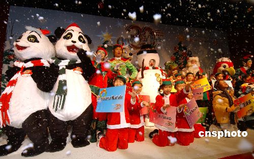 11月27日,香港海洋公園宣布,在12月15日至明年1月1日期間,將推出包括“冰雪世界”、“環(huán)球圣誕村”、“滿場驚喜玩之不盡”、“大玩特玩”四個主題景點,為市民及游客帶來白色的圣誕 。圖為當(dāng)日小朋友們、“大熊貓”及雪人在漫天飄雪的白色世界迎接即將到來的圣誕節(jié)。中新社發(fā) 蔡蔓莉 攝