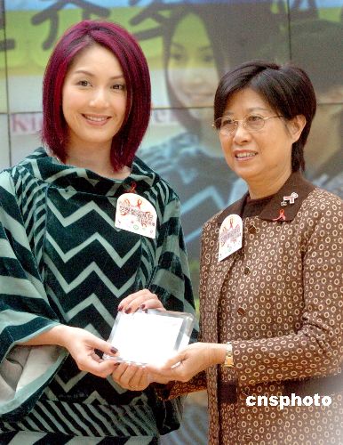 11月30日,“世界愛滋病日2007活動(dòng)開展禮”在香港舉行開啟儀式,行政長官夫人曾鮑笑薇代表大會(huì)向藝人楊千嬅致送紀(jì)念品,以感謝她為活動(dòng)拍攝宣傳短片,推廣正視對抗愛滋病的訊息。中新社發(fā) 鄧慶樂 攝