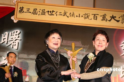 十二月七日,第三屆“溫世仁武俠小說(shuō)百萬(wàn)大賞”在臺(tái)北揭曉,年僅二十六歲、在北京工作的趙晨光奪得首獎(jiǎng),并獲得一百萬(wàn)元新臺(tái)幣獎(jiǎng)金。圖為聯(lián)合報(bào)發(fā)行人王效蘭(中)頒發(fā)首獎(jiǎng),由趙晨光的臺(tái)灣友人代領(lǐng)。中新社發(fā) 董會(huì)峰 攝