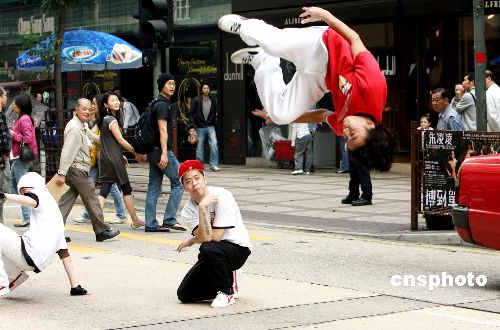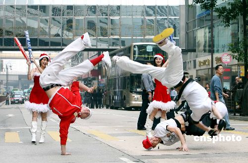 12月18日,香港B-Boys男子跳舞組合在海港城街頭大跳hip hop,靚麗圣誕女郎在場(chǎng)打氣,宣傳倒數(shù)迎接圣誕節(jié)活動(dòng)。香港海港城將在24日晚舉辦盛大的街頭派對(duì)讓市民、游客狂歡倒數(shù)迎接圣誕節(jié)。中新社發(fā) 洪少葵 攝