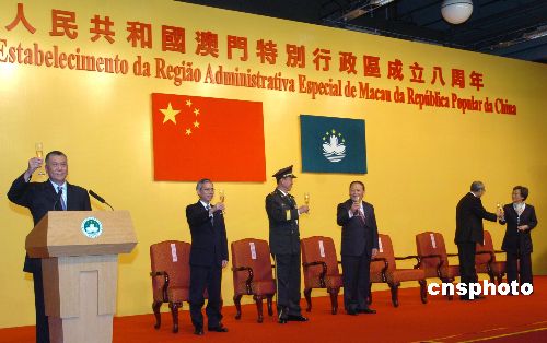 十二月二十日,慶祝澳門特別行政區(qū)成立八周年招待酒會在澳門旅游塔舉行,澳門特首何厚鏵在招待會上致詞,中央人民政府駐澳門聯(lián)絡辦公室主任白志健等嘉賓出席招待會,賓主舉杯共祝祖國富強繁榮。中新社發(fā) 史利 攝