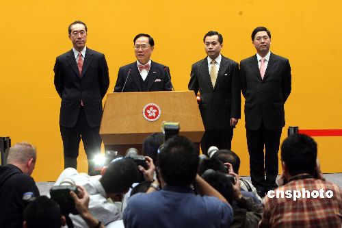 十二月二十九日,香港特別行政區(qū)行政長(zhǎng)官曾蔭權(quán)在政府總部會(huì)見新聞界,政務(wù)司司長(zhǎng)唐英年、律政司司長(zhǎng)黃仁龍和政制及內(nèi)地事務(wù)局局長(zhǎng)林瑞麟等一同出席。中新社發(fā) 武仲林 攝