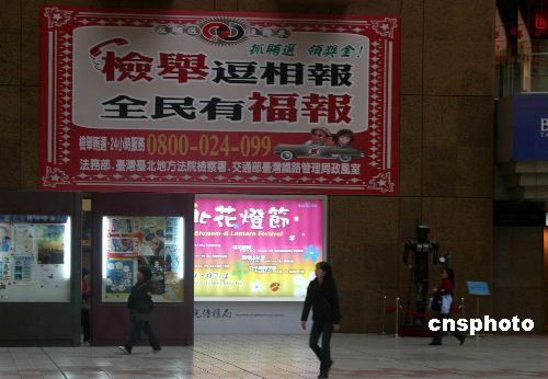 一月七日,距臺(tái)灣第七屆“立委”選舉投票日只有五天,選戰(zhàn)日趨激烈。臺(tái)灣檢方也加強(qiáng)抓賄選的街頭宣傳,圖為臺(tái)北火車(chē)站售票大廳內(nèi)懸掛的檢舉抓到賄選可領(lǐng)獎(jiǎng)金的巨幅廣告。中新社發(fā) 陳立宇 攝