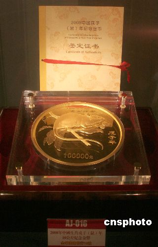 一月二十七日,由中國(guó)臺(tái)北奧委會(huì)、臺(tái)灣大洋金銀幣有限公司主辦的“第二十九屆北京奧運(yùn)會(huì)金銀紀(jì)念幣慈善拍賣會(huì)在臺(tái)北誠(chéng)品信義店舉行。圖為在拍賣會(huì)上拍賣,由中國(guó)人民銀行發(fā)行,全球發(fā)行總量只有十八枚的十公斤重鼠年紀(jì)念金幣,拍賣底價(jià)新臺(tái)幣一千二百二十萬(wàn)元。中新社發(fā) 陳立宇 攝