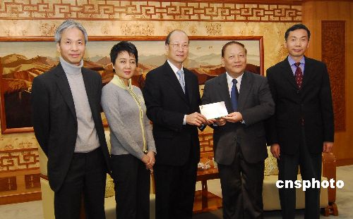 二月五日,梁安琪董事(左二)代表澳門博彩股份有限公司遞交捐善款五百萬澳門元(澳門博彩股份有限公司行政總裁何鴻燊博士?jī)砂偃f元,蘇樹輝博士(左三)五十萬元,吳志誠董事(左一)五十萬元,澳門博彩股份有限公司兩百萬元)救助內(nèi)地遭雪災(zāi)同胞。澳門中聯(lián)辦主任白志健(右二)接受善款并代表災(zāi)區(qū)人民表示感謝。中新社發(fā) 史利 攝