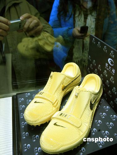 農(nóng)歷新年喜慶時節(jié),香港沙田馬場舉辦黃金藝術(shù)珍品展覽,展出二十多件設(shè)計獨特、手工精致的黃金藝術(shù)珍品。圖中以有世界飛人之稱劉翔破世界記錄時,以其所穿跑鞋實物原大打造的黃金跑鞋,引來眾多觀眾興趣。這雙黃金跑鞋長二十六厘米,黃金重約十六兩,價值超過二十三萬多港元。中新社發(fā) 王麗南 攝