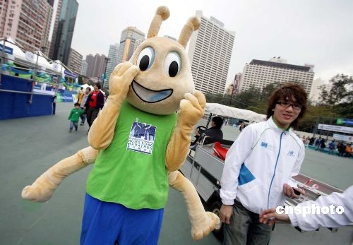 香港渣打馬拉松將在周日舉行,十六日,組委會在維多利亞公園舉行“為地球而跑—環(huán)保祝賀行動(dòng)”,呼吁推動(dòng)環(huán)保。圖為吉祥物穿梭會場宣傳助興。中新社發(fā) 洪少葵 攝
