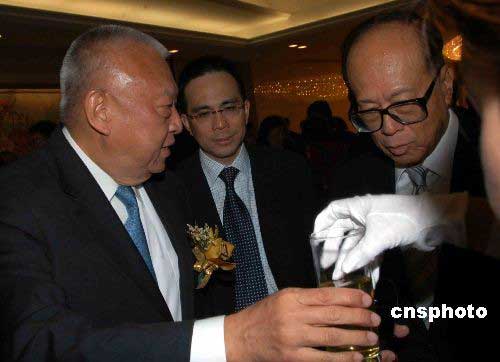 二月二十七日,外交部駐香港特別行政區(qū)特派員公署舉辦新春招待會,全國政協(xié)副主席董建華(左)與李嘉誠父子在招待會上交談。中新社發(fā) 譚達明 攝