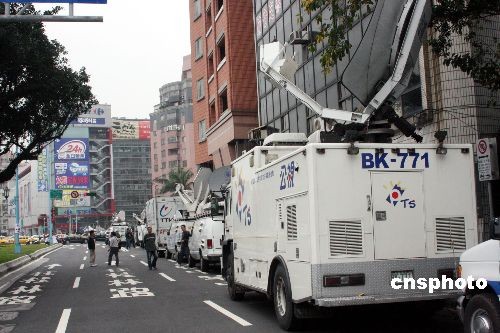 二00八臺(tái)灣地區(qū)領(lǐng)導(dǎo)人選舉投票三月二十二日上午八點(diǎn)開(kāi)始,中國(guó)國(guó)民黨候選人馬英九、蕭萬(wàn)長(zhǎng)競(jìng)選總部外,大批電視直播車云集,隨時(shí)做連線報(bào)道。中新社發(fā) 黃少華 攝