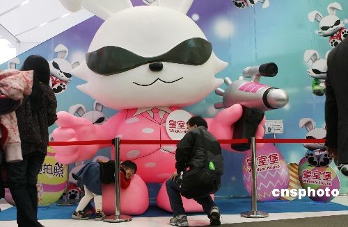 三月二十三日,一名小朋友與香港一商場(chǎng)內(nèi)的巨型復(fù)活兔合影留念。復(fù)活節(jié)期間,香港眾多市民通過(guò)購(gòu)物、旅游等休閑方式,歡度假期。中新社發(fā) 武仲林 攝