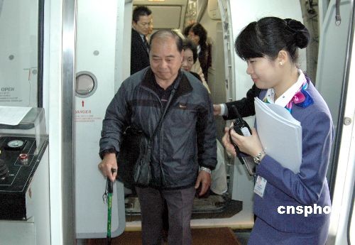 四月二日中午,臺(tái)灣復(fù)興航空公司兩岸清明包機(jī)抵達(dá)廈門機(jī)場,揭開本次兩岸清明包機(jī)廈門航點(diǎn)序幕。圖為服務(wù)人員精心照料年歲較大的臺(tái)胞乘客。中新社發(fā) 陳悅 攝