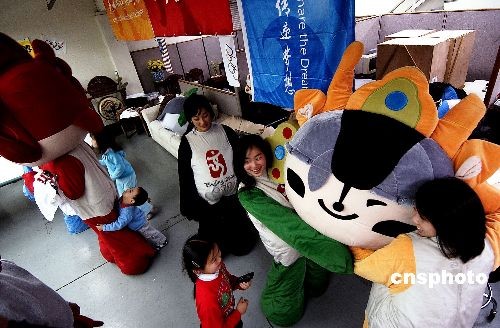 首次見到奧運(yùn)福娃的美國華裔兒童雀躍歡呼
