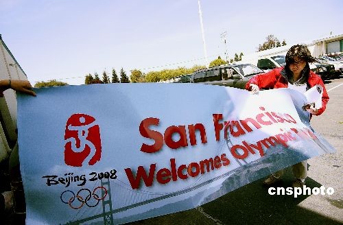 舊金山華人精制“迎奧運(yùn)火炬”巨大橫幅