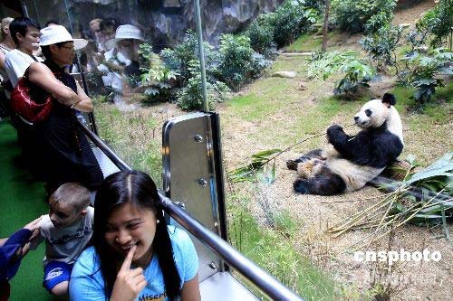 四月二十六日是大熊貓盈盈及樂樂到港一周年紀(jì)念日,香港海洋公園將于四月二十六日至五月三十一日推出“尋找熊盈樂”香港身份證推廣優(yōu)惠活動(dòng)。凡身份證或出生證明書上的名字印有“熊”、“盈”、“樂”或“P 、A 、N 、D、 A”的其中一個(gè)字母,即可享有購(gòu)海洋公園日間入場(chǎng)門券八折優(yōu)惠,并有十人獲得雙人探訪“四川大熊貓基地”之旅。圖為二十二日游人在海洋公園觀賞大熊貓憨態(tài)可掬的吃竹子。中新社發(fā) 王麗南 攝