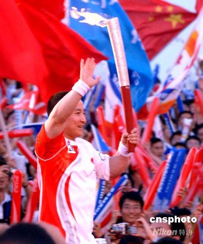 5月11日18時(shí)20分,隨著北京奧運(yùn)會(huì)火炬接力境內(nèi)傳遞福建福州站最后一棒火炬手雅典奧運(yùn)會(huì)舉重冠軍石智勇跑進(jìn)福州市望龍臺(tái)公園慶祝會(huì)場(chǎng),奧運(yùn)圣火福州站傳遞圓滿(mǎn)結(jié)束。當(dāng)日,208名火炬手完成了28.6公里福州站的火炬?zhèn)鬟f。 中新社發(fā) 劉可耕 攝
