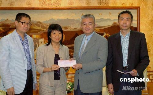 五月十三日,澳門中聯(lián)辦副主任徐澤(右二)接受盧德華女士(左二)交來(lái)的二十五萬(wàn)元港幣善款。這是五位澳門四川省政協(xié)委員捐助,用于救助四川地震災(zāi)民的善款。中新社發(fā) 史利 攝