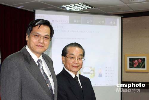 五月十三日下午,由“陸委會”主管的中華發(fā)展基金舉行《雅音四書集粹》推介會。推介以古漢語音韻誦讀的論語等“四書”。圖為“陸委會”主委陳明通(左一)、臺灣傳統(tǒng)詩學會副理事長黃冠人在推介會上。中新社發(fā) 陳立宇 攝