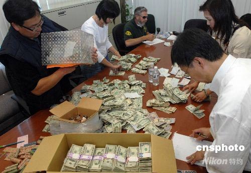 當?shù)貢r間五月十七日,四川大地震發(fā)生后的第一個周末,在洛杉磯地區(qū)工作生活的普通華人華僑頂著華氏一百度的高溫走上街頭,為遠隔萬里的災區(qū)同胞默默捐出一張張現(xiàn)金和支票。短短六個小時的街頭募捐活動共籌得四十萬美元。圖為羅省中華總商會會長莊佩源(左一)等人正在清點部分捐款。中新社發(fā) 張煒 攝