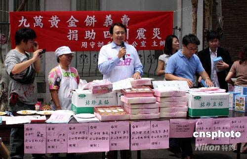 五月二十三日上午,國(guó)民黨“立委”周守訓(xùn)(左三)與“牛媽媽公益之家”合辦(左二為牛媽媽),在臺(tái)灣“立法機(jī)關(guān)”內(nèi)義賣黃金餅,收入將全部捐給臺(tái)灣紅十字會(huì),作為四川震災(zāi)后的重建基金,該活動(dòng)得到不少“立委”和工作人員的支持。中新社發(fā) 陳立宇 攝