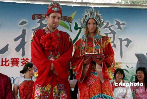 六月七日,正在臺灣師范大學(xué)進(jìn)修漢語技能的十六名老外,應(yīng)邀體驗(yàn)一年一度的臺灣“文山包種茶節(jié)”。由一對男女學(xué)生臨時(shí)湊成的“夫妻檔”,現(xiàn)場體驗(yàn)傳統(tǒng)中式“茶婚禮”,“新娘”為扮演男方家長的其他幾位外籍學(xué)生奉茶,完成“文定”儀式。中新社發(fā) 許曉青 攝