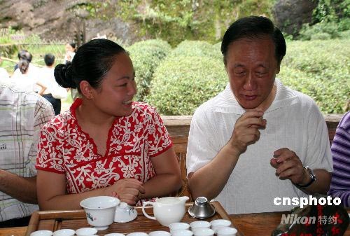 六月十九日下午,在福建參加“六·一八”項目成果交易會的臺灣新黨主席郁慕明來到武夷山參觀考察。圖為郁慕明在當(dāng)?shù)刂鑸@大紅袍景點(diǎn)學(xué)習(xí)武夷茶藝。中新社發(fā) 周文杰 攝