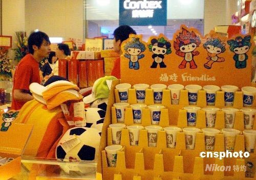 距離北京奧運(yùn)開幕日子越來越近,香港一些商場銷售奧運(yùn)紀(jì)念品的專柜生意紅火。 中新社發(fā) 洪少葵 攝
