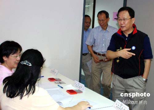 7月26日,中國(guó)國(guó)民黨舉行中常委選舉投、開(kāi)票。國(guó)民黨籍“立法委員”丁守中(右),第一個(gè)來(lái)到位于臺(tái)北市議會(huì)的投票所登記參加投票。中新社發(fā) 董會(huì)峰 攝