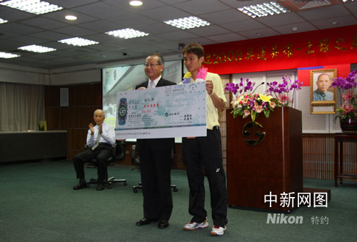 臺(tái)灣土地銀行27日舉行歡迎在北京奧運(yùn)會(huì)上打進(jìn)羽毛球男單八強(qiáng),并列第五名的中華臺(tái)北隊(duì)隊(duì)員謝裕興返臺(tái)表?yè)P(yáng)會(huì)。謝裕興大學(xué)三年級(jí)時(shí)加入土地銀行羽毛球隊(duì)。圖為臺(tái)灣土地銀行董事長(zhǎng)吳繁治向謝裕興(右一)頒發(fā)獎(jiǎng)金,以資鼓勵(lì)。作者 陳立宇